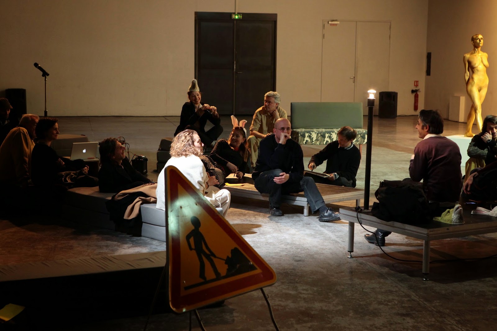 Je cite : « sa pratique plastique - actions, dessins, peintures, collages, photos...- s'est constituée à travers une expérience du théâtre, de la danse et du yoga. Le corps (son corps) peut tendre vers l'animalité ou au contraire questionner l'histoire de l'art pour mettre en avant la Vanité des créations humaines. Joueur, il manie la langue et ses jeux de mots, (c’est du corps au masculin qu’il s’agit) s'aventure dans des personnages qui lui donnent de nouvelles peaux ». En pratique, Sarah a un corps superbe, et quand elle le nappe d’or elle devient une sculpture (contemporaine) vivante. Je la regarde autrement : elle est Art (contemporain). Dès qu’il s’agit d’Art (contemporain), le commentaire s’élève aussitôt vers les sphères du virtuel, pour « questionner l’Histoire » (de l’Art), et entrer dans les concepts les plus sophistiqués (de l’animalité transgressée par l’humanité sensible notamment).