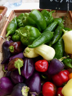 C'est Jeudi jour de marché : les producteurs (les productrices) sont de sortie, et ont amené leurs légumes d'été. Je pense à Jean-Pierre Coffe, il doit être content, c'est la saison des tomates de plein champ, il y en a partout sur les étals, plus colorées les unes que les autres. Rouges comme les pommes d'amour, elles sont aussi toutes vertes, ou rouges-avec-du-jaune, elles resplendissent, cirées comme des parquets. Elles ont le goût oublié des tomates d'été, vive l'été !