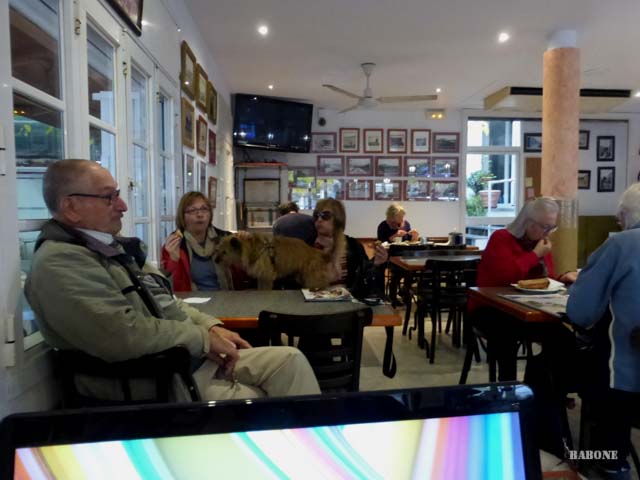 Elle commence par le rite de l'Hôtel Torreta, qui dispense le wifi, en échange d'un café super-fort-non-sucré à 1,15€, multiplié par 15, ça fait carrément le prix d'une clé 3G, mais ça fonctionne ! A l'intérieur, ça bavarde sur le fonds de télé ; ça déjeune de sandwiches ; ça boit du café, le chien sur la table ne gêne personne ! Une fois consulté la messagerie, sortie, direct sur la promenade, au bout, la mer.