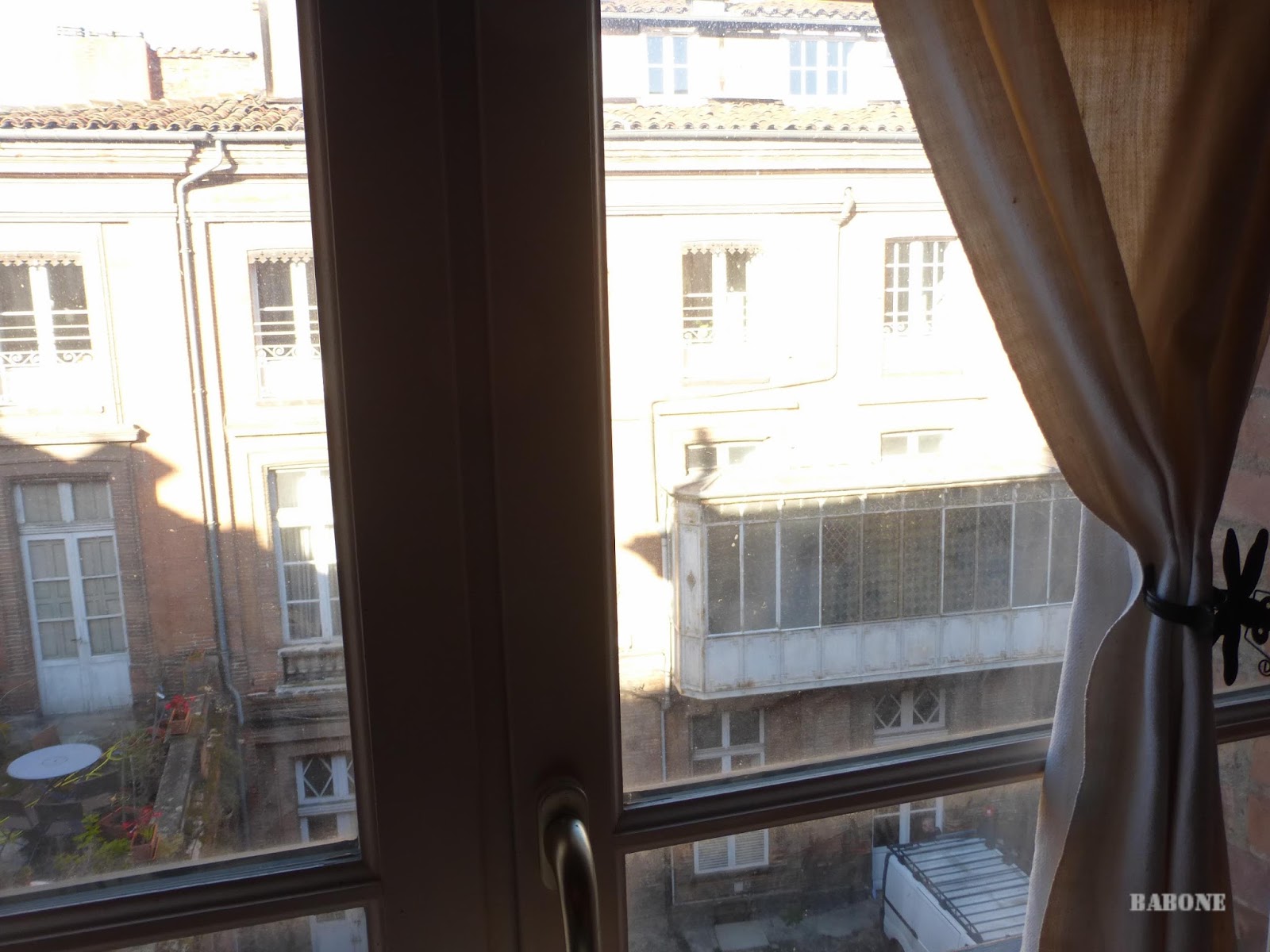 cour, les voisins (avocats), les vitraux, le ciel bleu de ce matin froid d’automne, froid et ensoleillé.