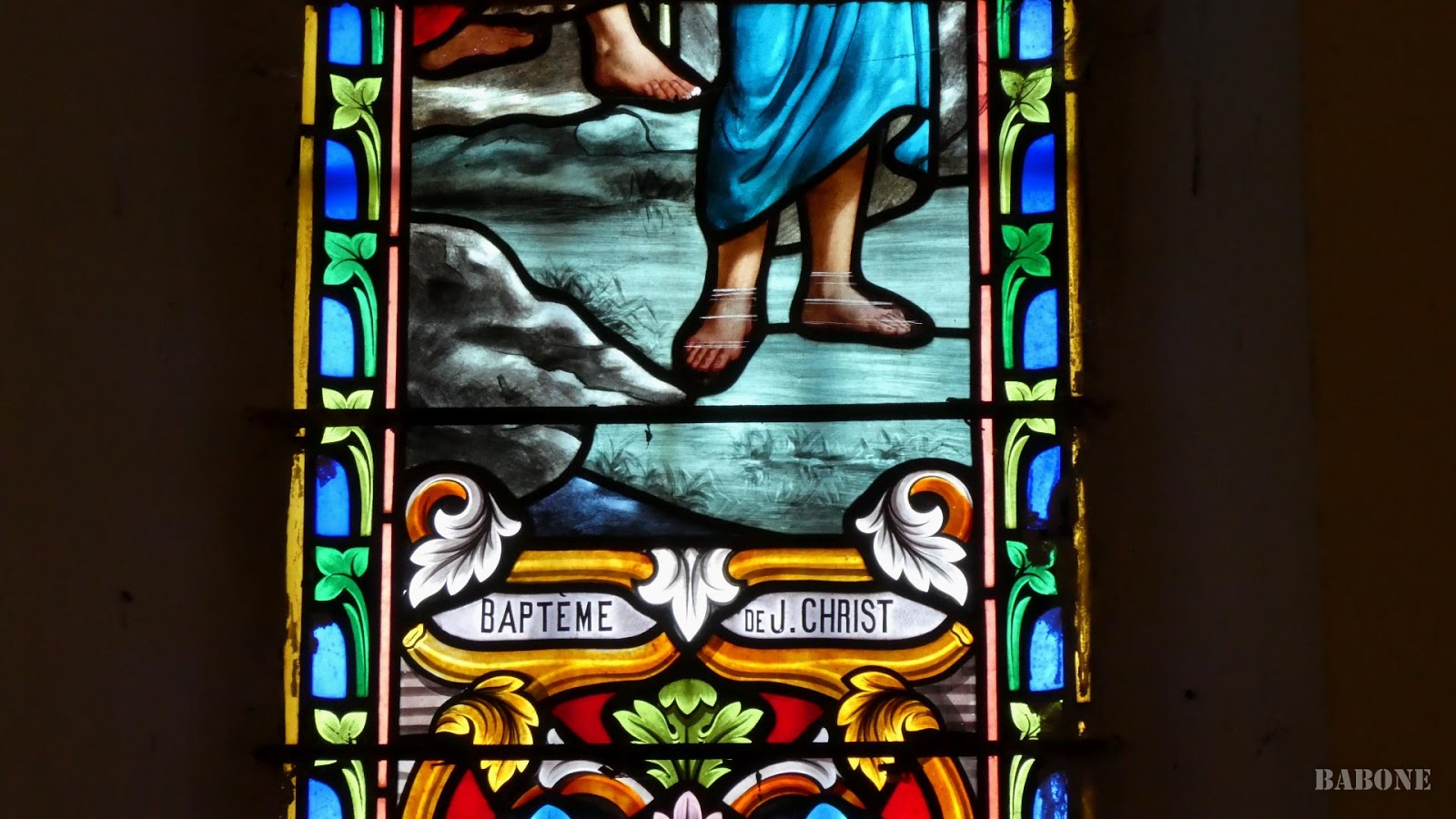 Dès l'entrée à gauche le baptistère est éclairé par le vitrail du Baptème de Jésus Christ, magnifique !