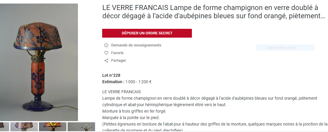 Je vous propose périodiquement de constituer une collection de verreries de Charles Schneider, étant moi-même surpris que cela soit encore possible, cent ans plus tard ! Voilà un nouveau décor, celui "aux aubépines". Le prétexte est une vente aux enchères, comme celle survenue il y a peu à Beaune : de manière inhabituelle, une lampe était à vendre, une pièce bien rare. Enchérir est difficile à distance, une première difficulté est bien entendu de trouver l'argent pour payer la vente et les frais, une autre pire encore est d'obtenir que l'objet payé soit soigneusement emballé, il s'agit de verre, et enfin soit envoyé par la poste, qui voulez-vous qui fasse cela à distance ? Mais restent les images, et elles sont gratuites !