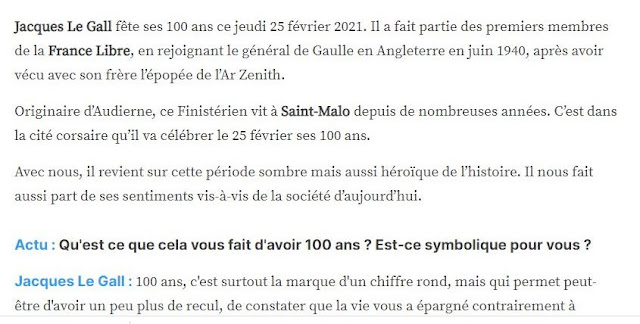 C'est une coîncidence : deux Résistants, héros de la Libération, ont cent ans à quelques jours de différence ... mais à 850 Km de distance ! Le nôtre c'est "tonton Jean" aujourd'hui, fêté à la Mairie en groupe restreint, cause covid. (1) Le breton qui plus est est Malouin, c'est Jacques Le Gall, qui a rejoint de Gaulle à Londres à la première heure. Quand s'agissant du covid on évoque le mot "guerre", on prend conscience combien Jean et Jacques ont vécu la vraie guerre !