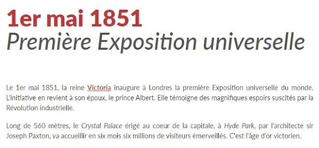 Avec le recul les dates se télescopent, trente ans plus tard, le 2 décembre 1851, c'était le coup d'Etat de Napoléon numéro 3..., mais le 1er mai 1851, jour du muguet, c'était la première exposition universelle du monde : à Londres, lancée par la reine Victoria !
