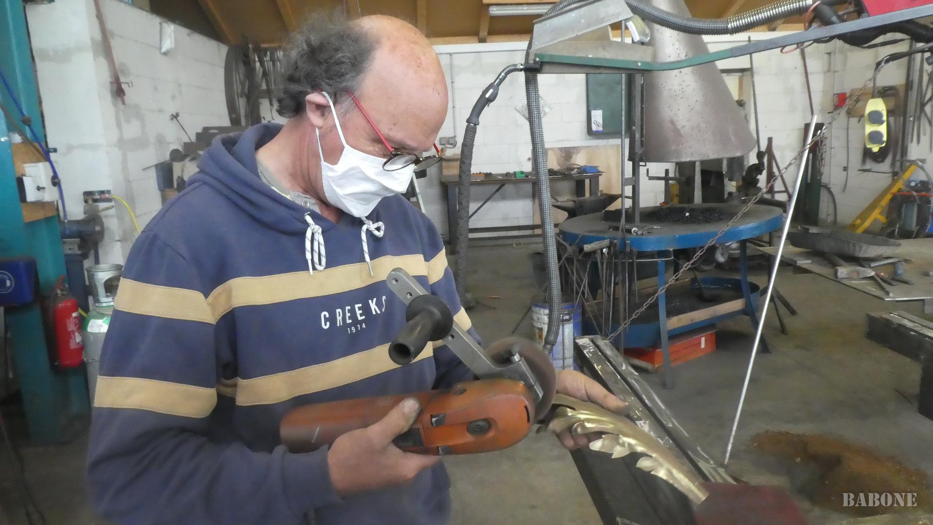 L'atelier est immense. Des machines comme avant, un tour, des perceuses, un marteau-pilon pilonne les pointes de fer destinées aux grilles d'un voisin qui refuse qu'un quidam passe par dessus ! Et quand je lui explique qu'il me faut une potence, André va en chercher une toute rouillée (le pied car il y a une patine) parmi les cinq ou six qui sont rangées contre un mur.