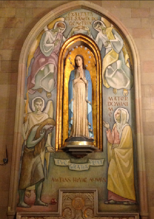 Si je puis un peu développer, les mains jointes de Marie rappellent les rites féodaux de la vassalité et évoquent son obéissance inconditionnelle à Dieu. Si Eve, en quête d'autonomie par rapport à Dieu, a perdu la grâce, Marie cherchera toujours à être « l'esclave du Seigneur » et restera « pleine de grâce » toute sa vie. C'est ainsi que le proclame l'inscription Ave gratia plena, et les anges du ciel, qui la saluent tenant son emblème ( AM : Ave Maria) se réjouissant de l'annonce de sa victoire sur le péché : "Tota pulchra es Maria et macula originalis non est in te" . Ils célèbrent un nouveau mode de vie qui apparaît dans le monde : la vie de grâce, la vie qui vainc le péché et son instigateur, Satan, qui s'était emparé du monde, mais est maintenant piétiné par Marie.