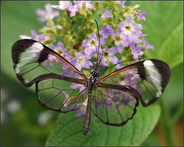 These little marvels are feats of both beauty and nature's masterful engineering ! Their wings look like transparent windows, rendering them as nearly in visible. Take a closer look as glassing butterfly in action
