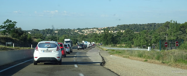 l'avantage de partir tôt : il fait frais, on arrivera plus tôt... ... l'inconvénient de partir tôt : les bouchons avant Nîmes... |