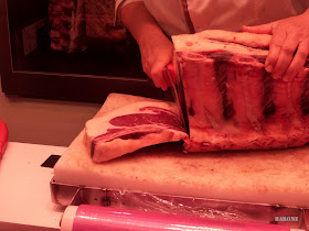 Je taquine la patronne de Virgili, qui vend de la viande magnifique, maturée noire (de la vache espagnole m'explique-t-elle, pas du taureau), parfait pour le barbecue ce soir :